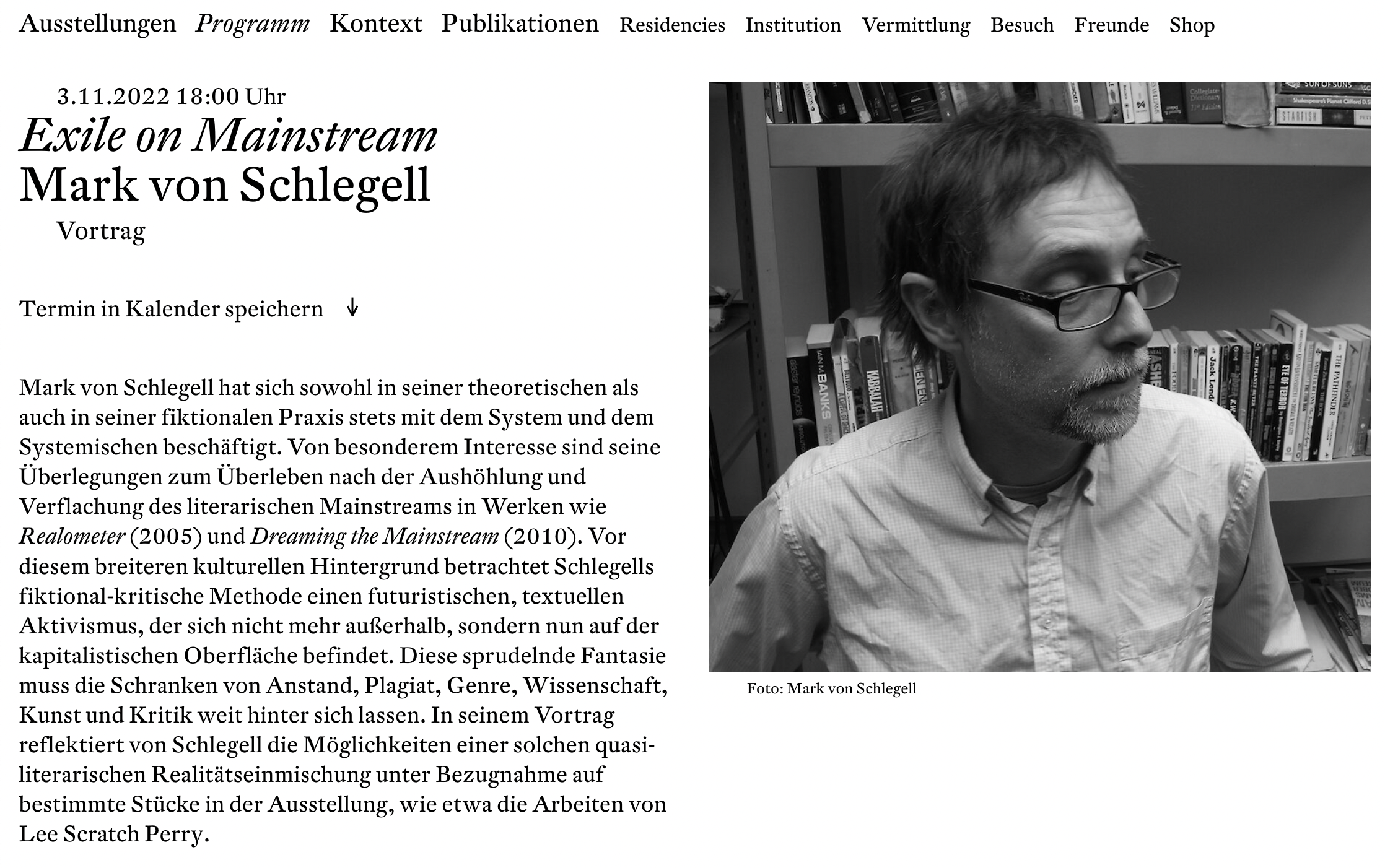 https://halle-fuer-kunst.at/en/program/2022-11-03-exile-on-mainstream-vortrag-mark-von-schlegell/ Share this: Click to share on Facebook (Opens in new window) Facebook Click to share on X (Opens in new window) X Like Loading... Related